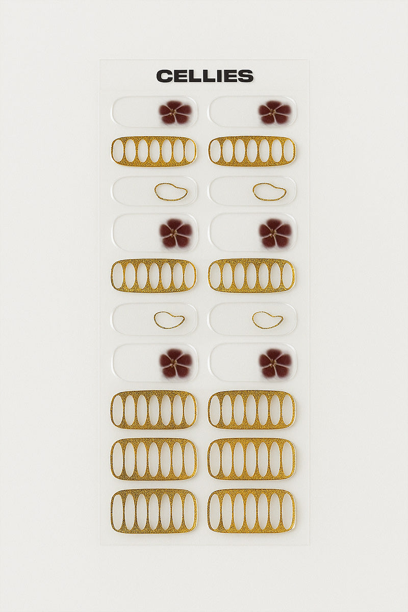 This set includes 20 ultra-flexible gel nail stickers in varying sizes, designed to fit every nail shape with ease. Each sticker is carefully created: first designed in Photoshop by our owner and female engineer Celine, then printed with real gel and foil, and cured for two full weeks for exceptional shine, durability, and depth.